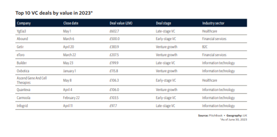 The largest deals in H1 2023 were a mix of stages and sectors, with four being venture-growth deals. The top deal was made by wellness testing startup YgEia3 for £602.7 million, which was quickly followed by consumer finance firm Abound's £500 million deal and Mubadala Investment's £383.9 million investment in on-demand grocery player Getir. This demonstrates the diverse range of industries that are attracting significant investment in the UK VC market.